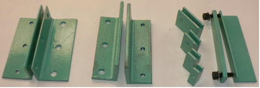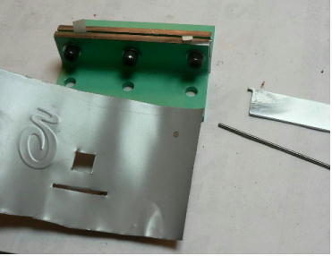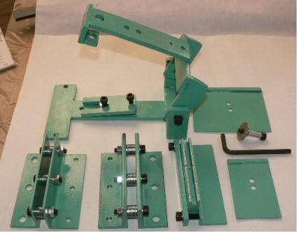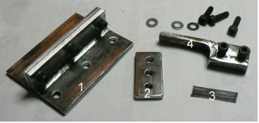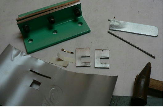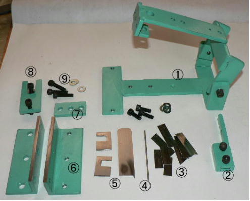 | 構造編 【板金折り曲げモード】 ![]() ホビーお好み板金機の「板金折り曲げ」をするときの構成部品です。「3ミリパンチャー」や「溝抜き」の時の部品は写真に撮っていません(混乱するといけないので)。 ![]() 本体です。右側に蝶番が付いています。付属のL型レンチで「締めたりゆるめたり」します。この装置の原理は板金屋さんがやっている作業を、熟練の技が無くても折り曲げが出来るように「蝶番」の作用で、ちょっとお手伝いしようと「刀刃」を支えているだけです。ですから「ホビー板金冶具」です。 使い方は簡単で、板の曲げたい位置を合わせ、刀刃を叩くだけです。曲げる長さは手間を惜しまなければ自由自在です。 ![]() 刀刃を受けるM台群です。左が「ノーマルM台」真中が「強力M台」、右が「分割M台」です。使い方は使用編で、ご説明します。 ![]() ノーマルM台ですが、 2枚のアングルの組み合わせです。赤矢印の辺の長さと黒矢印の辺の長さは違います。この組み合わせは、曲げたい板の厚さや硬さによって使い分けます。また「内側直角」とか「R曲げ」でも使い分けます。 ![]() 左の写真が「強力M台」です。この台は使い方で 3ミリのフラットバー(鉄)でも曲げる事が出来ます。もちろんその時は刀刃ではなく、まともな「平タガネ」を使用します。やり方は使用編でやります。右は分割M台です。 10ミリから 85ミリ+アルファまで 5ミリ単位でセット出来ます。これが無いと曲げられない方向があるからです。これも使用編でご説明します。 ![]() M台を軽く固定する金具です(しっかり固定してはまずい)右の写真のように取り付けます。黒矢印は固定ポルト、赤矢印は高さ調整ポルトです。これはあとからやる「溝切り」の時にも使用します。 ![]() ノーマルM台の組み立て例です。厚さ 1ミリの平ワッシャを 10枚挟んで3ヶ所で止めています。つまりこのM台は 10ミリの幅(スリット)になっているわけです。これは5000番台のアルミ板も軽々と曲げることが出来ます。もちろん内側直角には出来ません、内側直角にするには、強力M台と、ある技?が必要です。それは使用編で(なに、手間がかかるだけです)。 ![]() M台を仮固定しました(平ワッシャを 10枚挟んだままですが、普通は 1枚から 3枚程度です)。 ![]() 付属の刀刃 2種です。 50ミリ幅と 100ミリ幅です。右写真のようにポルト 1本で止めます。このポルトはあんまり締めつけません、理由はシーソーさせるからです。つまり叩いた刀刃のあたりが大きく曲がる訳です(大きくと言っても角度にしたら 3度ぐらいですけど)。 ![]() わざと斜めにしました。もちろんこんな使い方はしません(でもこれから溝キリのヒントが)。 ![]() これは厚さ 5ミリの「強力M台」です。上の部分は丸みを帯びています。本当は「相対放物線」(注1)に研磨したかったのですが、中型のフライス盤が無いと出来そうもないので、手間がかかりますが、平ワッシャの組み合わせで実現することにしました。 注1 ヤゲン式折り曲げにおける私のあみだした板の折れ曲がりの最適曲線の事です。板の回復可能角と回復不能角を考察して、理想的な折れ曲がり環境を作り出そうと・・・ま、想像してみて下さい、裏側の曲げキズがほとんど付かないかもしれません(裏側の曲げキズが付かないというのがヒントです)。 この装置では、裏側の曲げキズ防止に PP(ポリプロピレン袋)を挟むことをお勧めします。 震災のお手伝い、寄付以外に何も出来そうにないので、仕事に没頭することにしました。 11 【強力M台を単独で使う】 「ホビー板金折り曲げ冶具兼 3ミリパンチャー」というのは長ったらしいので、名称変更しました。ところで今日は「ホビーお好み板金機」に付属している「強力M台」を単独で使用する技です。 ![]() @は「強力M台」です。この表面が研磨されている部分を使います(この部分は折り曲げに使ってはいけません)Aは「2ミリの丸棒」、Bは「厚さ 2ミリのスペーサー」です。Cが「厚さ 2ミリのタガネ」です。今回は幅 2ミリのスリットを切ろうとしています。 2ミリのスリットは、スライドポリユームの溝とか、スライドクランクの溝切りに利用出来ます。1ミリとかもタガネその他を準備すれば出来ます(ベロ溝は別の手があります)。 ![]() 2ミリのスペーサーをM台の隙間に入れます。右写真の黒矢印は紙です。紙一重という訳です。この紙で、タガネや丸棒が、隙間にスルスル入ります。 ![]() 次に材料の下準備です。二か所 2ミリの穴をあけておきます(四角い穴は昨日の物です)この二つの穴をつなごうという訳です。 ![]() まず 2ミリの丸棒を片方の穴に入れ、スリットまで付きとおします。そしてタガネの尖っている部分を反対側の穴に入れ、こちらもスリットまで付きとおします。 ![]() あとは金槌で軽くたたくだけです。赤矢印はタガネをとったところです。写真撮るの忘れましたが、左の丸棒を引き抜いてこの穴に入れ、今度はタガネを反対側から入れて打撃していきます。 ![]() 作業終わり、。きれ