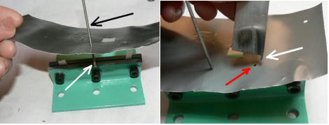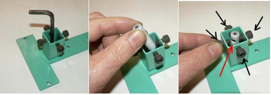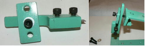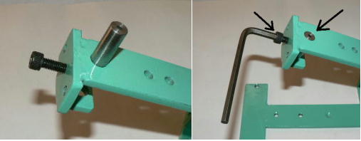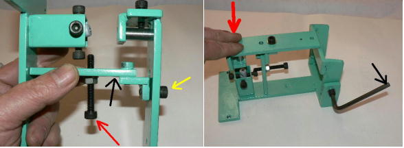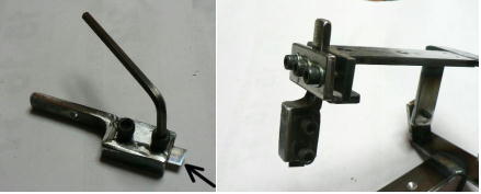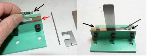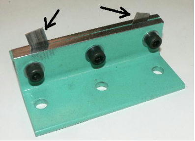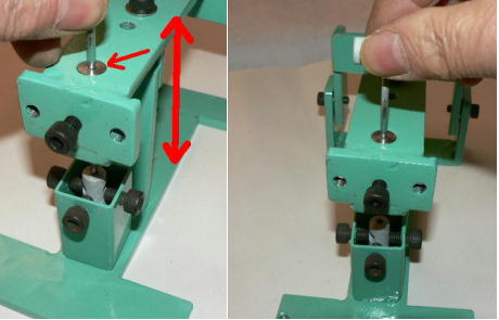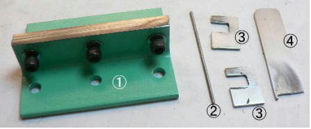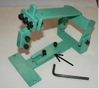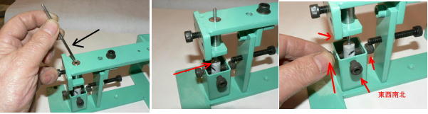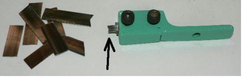 | 構造編03 【溝切りモード】 ![]() 溝切りモードに使う部品群です。 @本体 A溝切りホルダー B厚さ 0.8ミリのスペーサーとタガネ Cガイド棒 D厚さ 2.0ミリのスペーサーとタガネ E強力M台(研磨面) Fダメ押し当て板 GM台押さえ Hホルダー固定ポルト ![]() ホルダーにタガネ(この場合厚さ 0.8ミリの奴、幅6ミリ)を入れてしっかり固定します。 ![]() ダメ押し当て板を付けてホルダーを固定します。目視で良いですから、出来るだけ垂直になるよう取り付けます。 ![]() こんな感じになります。黒矢印はスリット押さえ(強力M台)です。 ![]() 強力M台の研磨面が上に来るようにして、スペーサー(黒矢印)を入れます。この時、スペーサーに紙等を巻きつけて、タガネがスリットにスルスル入るようにしてから締めつけます。 ![]() 調整します。タガネを降ろしていき、スリットに吸いこむように入るように位置を合わせます。 一度打撃しますと、必ずズレます(突き刺さった板を外すので)打撃のたびに調整する必要があります。それを防ぐ方法がありますが、実践編でご紹介します。 hayashi_hopyi@yahoo.co.jp 通販のページへ トップページへ |