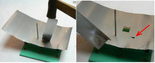 【折り曲げの原理編】 【3ミリパンチャーの原理編】 【溝切りの原理編】 【折り曲げの原理編】 薄い金属板を折り曲げる状態は 2種類あると思います。「常温」で曲げる場合と、材料を「高温」で曲げる場合です。金属以外では「温める」程度の物もありますけど、金属は温める程度では劇的な変化は無いと思います(そのほかの方法もあるかもしれません)。 常温で曲げる場合、「肉抜き法」という手もあります。適度にこれを使うと、「折曲機」等使わなくても手加工のみできれいな折り曲げが出来ます。ほとんど折り紙みたいに出来ます(そのかわり曲げたところが極端に弱くなる)。 曲げる機械的な方法を考えるといくつかあります。通称「ヤゲン式」というのが一般的です。機械的な構造は沢山ありますが、原理はおおむね同じです。 そのほかに「翼曲げ」(呼び方ちがうかも)というのがあります。○ー○○のけー・・・は、この一種と考えられます。私の考案した「中央先行折り曲げ板」(笑)もこの一種です。 ホビーお好み板金機は「ヤゲン式」ですが、一般的な折曲機と違って「板金屋」さんの使う手法をとっています。つまり打撃です。普通の折曲機はじわじわと強大な力をかけていきますが、ホビーお好み板金機はコンコンと少しずつ打撃で曲げていきます。 コンコンと少しずつ曲げていくなんて一体一回の打撃はどの程度?という問題があります。こればっかりは実践しかありません、材料によってとか、幅とかで大幅に変わります。 昔、中学校の技術の授業で、トタン板で「チリトリ」なんかを作るところがありましたが、トタン板加工なんて見かけなくなった今日この頃では実践している学校は少なくなったのではないでしょうか。 さて、ホビーお好み板金機のヤゲン式打撃折り曲げの最大の敵は「空気」と「質量」です。打撃ですから、曲がるときは非常に早く曲がろうとします。すると空気抵抗で「曲がり遅れ」が発生します。大工場の大型折曲機では、そのスピードを調整する機能があるほどです。 それと「質量」、例の「動いているものは動き続けよう・止まっているものは止まり続けよう」という奴です。これもなかなか厄介です。この二者が結託して折り曲げを邪魔します。 それに「どこから曲がる?」という問題があります。万力に挟んで曲げるのは簡単ですが、自分の思い通りのところから曲げる・・・というのは実に難しいです。これは一辺だけ挟んで曲げようとするからです。 ヤゲン式の場合はもう少し楽です。刀刃の先端が当たっている部分から曲がるわけですから、しかしM台の幅によっては油断出来ません、刃先が滑ってずれてしまうかも知れないからです。 M台の幅が広いと曲げるのは楽です。最初から幅が狭いと、一般的な折曲機では強大な力が必要になり、打撃式では先ほどの二者も加わってかなり曲げずらくなります。 なんだかなが長々と書いてしまいましたが、何を言いたいのかと言いますと、「ヤゲン式の場合、M台の幅は可変式が良い」ということです。そこで色々考えたんですが、色々な幅のものを沢山作るのは大変です。それに加工材によっても、仕上がりの見てくれもあるし。 そこで「平ワッシャ」を利用して色々な幅にセット出来るM台を考案しました。硬い・あるいは厚い材料の時は幅を広くして曲げ始め、少し曲がってきたらだんだん幅を狭くしていくのです。実はこれを解決するのが「相対放物曲線仕上げM台」なんですが(まだ認知されないようですが)(笑)。 私、「人間フライス盤加工」(笑)を長時間やって 1台だけ作ったんですが、めんどくさいのなんのって、でも性能はばっちりでした、地震でどっか行っちゃった、今工房内は機械は直しましたが、棚やらロッカーは倒れたままです。あまりの散らかり様にやる気ゼロです(コンビニの品物レベルではない、ポルトとかナットとかもあるし)。 書いているうちに何だか最初の目的からずれてきたような・・・。 hayashi_hopyi@yahoo.co.jp 通販のページへ トップページへ |