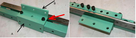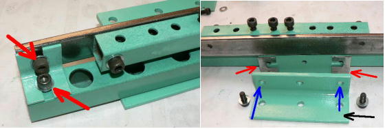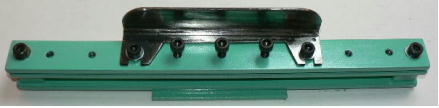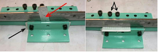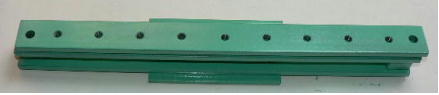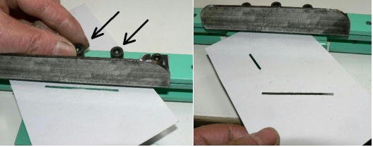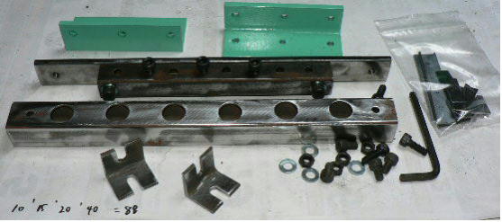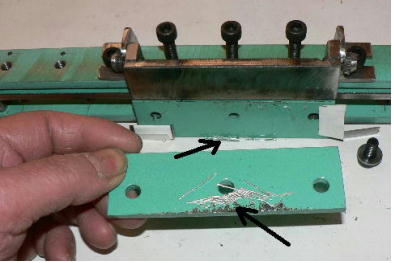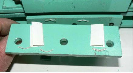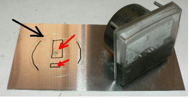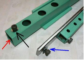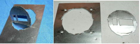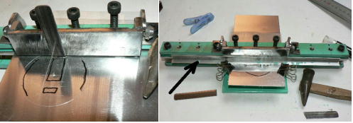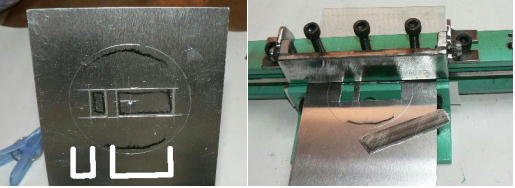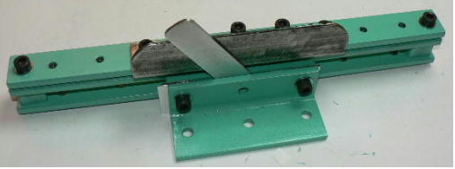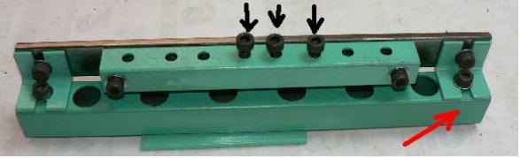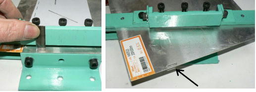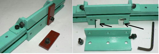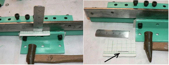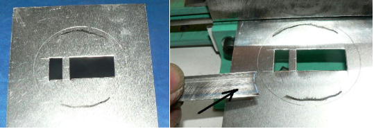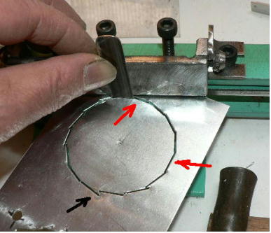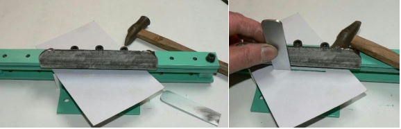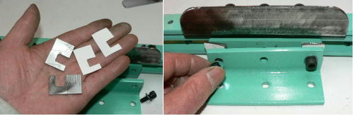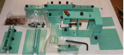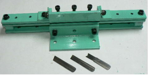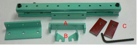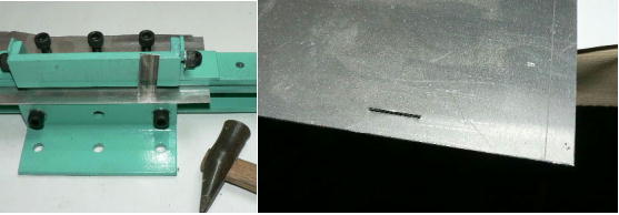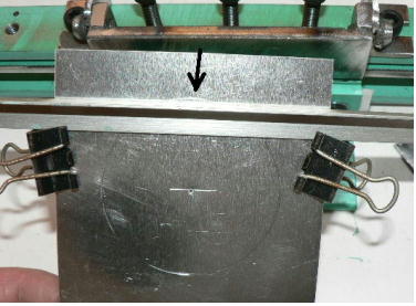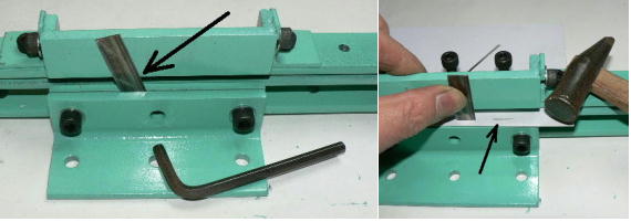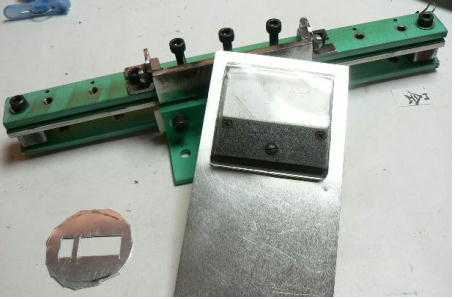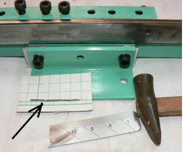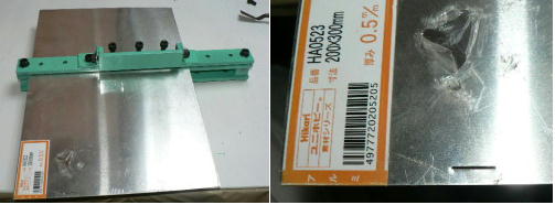 | (ホビーお好み板金機、関連です)。 「どこでも角穴あけとか打ち抜き機」とは、工作用紙やボール紙・薄い金属板の好きなところに(平板に限る)溝や角穴をあけられる創作工具です。溝の幅は 0.8ミリと 2.0ミリです。メーターやモーターのフランジのような大穴もあけられます。平板へ「いきなり」の穴あけです。 打ち抜きは、上にある「刃」と下の「受け」が重要です。大げさに言うと「ミクロン単位」であっていないときれいに打ち抜けません、少しでも離れていると「バリ」になりますし、当たると刃が損傷します。 私はこれを「案内板」を使うことで解決しました。「タガネを案内板でスリットに導いてやる」のです。その時タガネを案内板に押し付けるのは「指」でやります。 ここで一つ心配な事があります。「タガネが折れないか?」という心配です。工作機械に「メタルバンドソー」というのがあります。このバンドソーのブレード(ノコ刃)は、使っているうちに切れてしまいます(大抵溶接部分、98パーセントぐらい)今までは捨ててしまいましたがこのノコ刃、なかなか強靭で「しなやか」です。わざと折ろうとすると曲がってしまいます(ある程度のところまで)。 という訳で「手作業」にはうってつけです。似たような物で金切りノコの刃があります。こちらは注意して下さい、こいつは折れます。安全の為必ずメガネと手袋をして下さい。 中心になる「スリット台」は、ホビーお好み板金機の「強力M台」の研磨面を使用します。本体の組み立ては、この下にある「開発秘話」をご参照ください、ここでは一番重要な部分の組み立て方をご説明します。 ![]() 一番上が本体、左が強力M台の方割れです。あと半分は本体にとりついています。Aはスイングガイド板、Bがそれを支えるアングルピース、Cは「ツラ」を合わせるための定規です。 一番重要な案内板の取り付けと調整方法。 ![]() まずアングルピースを取り付け、スイングガイド板(案内板の事)も取り付けます。この 4本のポルトはまだ締めつけません。 ![]() 定規板を強力M台に取り付けます。そしてその定規に案内板を押しつけます(この板はスイングします)クランプを使っていますが、大げさに強調しているだけです。手で押さえているだけで十分です。そのまま 4本のポルトをしっかり締めつけます。これで上下の面のツラが合いました。 ![]() その後定規板を取り外し、スリットの準備をします。今回は 0.8ミリ幅のタガネです。ユルユルにするために紙を一緒に挟みます。折り返して 2枚にしてみました。紙はカレンダーの物です。 ![]() 締めつけてタガネを入れてみたところ、スルスルと丁度良いあんばいでした、早速ボール紙を抜いてみました。 ![]() なかなかの切れ味です。 ![]() ボール紙や工作用紙ばっかりやってると、疑われそうなので、 0.5ミリのアルミ板を抜いてみました。 ![]() こんな具合に 200ミリでも悠々入ります。右は抜取った跡です。とてもきれいです。 ![]() 次は 1ミリのアルミ板を抜いてみました。叩く回数が少し増えるだけです。コンコンで抜けてしまいます。 ![]() ある程度作業したら、「カス取り」します。今回使ったタガネの先端は「ヘの字」ですので、こんな具合に隙間に入っています。 ![]() これで完成しました。これさえあれば工作の幅がグンと広がると思います。 今回のタガネは「メタルバンドソー」のブレードの切れた奴です。一杯あるもんで使ってみました。なかなか強靭です。適度な粘りもありまして、金ノコの刃みたいに「パキッ」と折れたりしないので安全です。厚さは刃のアサリをとりますと 0.8ミリです。 打ち抜く場合、一回ごとに打ち抜いてしまう方法と、スライドボリュウムの長穴のように一直線に連続して打ち抜く方法とあります。いずれも直線に限ります。円弧には打ち抜けません、円の場合は一回ごと角度を変える必要があります。その場合ヤスリ仕上げが必要の場合があります。 アングルの秘密。 ![]() これは 5×40×40アングルりの、一部切り取ったものです。建材用アングルです。「日本工業規格」という本によりますと、黒矢印の部分と赤矢印の部分では「肉厚」が違います。ちょっと見・同じ厚さに見えますが違います。 ついうっかりしてこの部分を使ってしまいました。そのため「強力M台」との面の競合に失敗してしまいました(職人仲間で言うところの「ツラがあわねぇ」というやつです)(笑)。 開発秘話みたいな。 2011.3.26 ![]() 上の方は「ホビーお好み板金機」に元々付いている「強力M台と部品」です。フラットバー3本とその下は、今日思いついた新型の「どこでも角穴とか打ち抜き機」の部品群です。 ここから下は、組み立て説明を兼ねているので、ちょっとしつこいです(笑)。 ![]() まず「強力M台」のネジが切れている方のアングルの上に、このフラットバーをのせ、 2ヶ所ボルト締めします。取り付け位置はとりあえず真ん中にしました。ここはどの位置でもかまいません、加工する場所