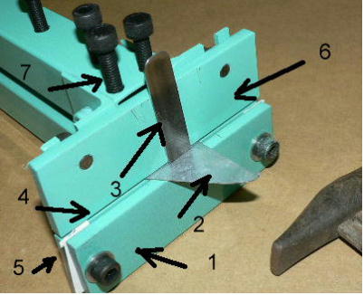 1=スリットを作る手前の板、スリットの幅はこの板の取り付け時の左右の挟み板で変わります。