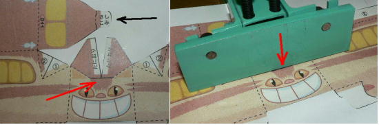 全体紙なので、カッターナイフで切り取れちゃうんですが、一番メインみたいな中央のベロとベロ溝部分、(赤矢印と黒矢印)金属で作った時はこの装置があれば簡単に加工出来ます(もっとも今回は紙だからカッターで十分ですけど)。