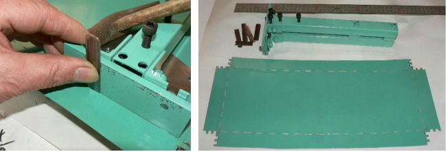 板金折曲機を使わないで「板金工作」をします。板の折り曲げには「肉抜き法」という技があります。普通は板の曲げたいところを削ったり穴をあけたりして弱くする方法ですが、今回は
