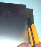 厚さ「0.5ミリ」の「カッターナイフの替え刃」を両面テープで張り付けてみました。危ないので刃は殺してあります。(コンクリートとか砥石とか石ころで刃をつぶす)