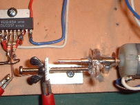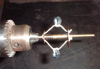 ちょっとわかりづらいですが3ミリのシャフトに接点を接触させ給電します。(一応セロテープで絶縁したんですがあとでえらいことに)ボール盤のスイッチをONにし、右側の大きな円盤に接点(この場合ワニ口クリップ)を接触させるとボール盤は回り始めます。するとクリップの位置により「回転・停止、というか有電圧・無電圧」が繰り返されるはず・です。(クリップの先端はかなり焦げてしまった、100ボルトだもんね)