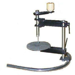 左図のように受け台をずらし、アームを下げれば、自分の足下に穴をあけることが出来ます。本箱のような工作の時、木ねじの下穴を簡単にあけることが出来ます。 |