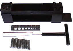 | 電子工作用パネルパンチャーとは、電子工作に付き物の、スイッチとか、ヒューズ・電源ランプ・プラグ・ジャック・コード・VR・7セグメント液晶表示器の角穴、その他諸々の、パネルにあけなければならない(メーカーによって雑多)穴を、電気ドリルを使わずに、すべて引き受ける、簡単で安全な工具です。コタツ・・・とはいきませんが、茶箪笥か、勉強机と金槌があればOKです。又、電子工作以外でも応用範囲は広いと思います。 |