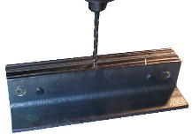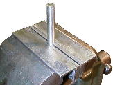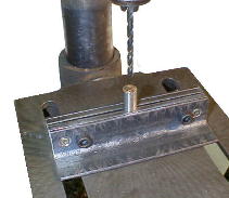 この写真は、今回製作した【片ボス治具】に10ミリの丸棒をくわえ込み、ボール盤の台の上にのせたところです。 |