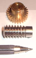 上がウオーム車、(ウオームホイールとも言う) 中がウオーム、