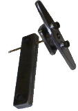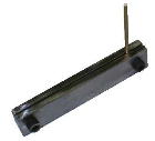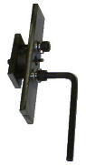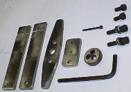 | 6*25程度の平鉄(フラットバー)を49ミリに切断します。切断する前に中心に3.0ミリの穴、そこから半径16ミリのところに5.2ミリの穴二カ所をあけ、6*1.0ミリのタップを立てます。(直径25ミリのダイスの場合) | |
