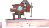 横から撮った写真です。 この万力は挟むところの後ろに小さな金敷が付いていて、何かをつぶしたりするときに便利です。現在もあんまり形が変っていません、4.000円前後で買えると思います。 |