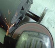 モーターを仮止めし、通電して回転させながら外周をサンダーで削り仕上げします。私は慣れているので足でモーターを踏みつけ、いきなり削っていますが、やはりしっかり固定して作業した方が安心です。(このとき側面も削るという手もありますが、面倒くさいのでやめます)