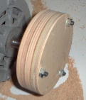 次にベニヤ板で円盤を2枚作ります。直径110ミリくらいです。左側の円盤は切断砥石を取り付けますので少し厚くて硬いもので
