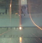 前から見たところです。砥石は上から下に動いているので、部材は非常に安定しています。この写真でもお分かりのように、手放し運転です。手を添えるのは切り始めと切り終わりの時だけです。(おもりの力で前に進んでいます)