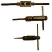タップハンドルです。上が普通の物で、下はハンディタイプ、中はラチエット付きです。ハンドフリーで作業しますから、後記の工具を創作するまでは、バキバキ折っていました。 |