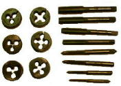 | ダイスにはこのような種類はありません、その代わりにスリットの部分に小さなネジ(ホロセット又はホーローセットと言う)がありまして、このネジの調整でタップの3種類と同じ効果をあげるようになっています。つくば工房の製品は、中仕上げに調整されています。 |