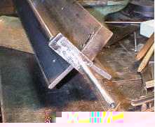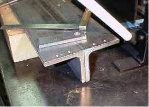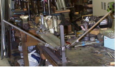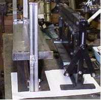 Xウイング・・・じゃなくて、左右のアングル(8*65*65)を、45度ずつ動かしたところです。この折り曲げ機では、ここが命ですから10分の1ミリ以下の精度で加工しています。これを実現するのに1週間かかりました。今は数分です。 |