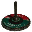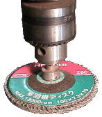 多羽根ディスクとは本来、100ミリディスクグラインダーに装着して、毎分10000回転ほどで回転させ、鉄、ステンレス、非鉄(アルミ、銅等)石材、ガラス、プラスチック、木材等の研磨、研削、錆落とし、バリ取り、つや出しなどに使用する回転ヤスリです。紙(布?)ヤスリを短冊状にして円周状に張り付けたような構造で、粒度40・60・80等あります。私は60を使用しています。 |
