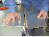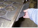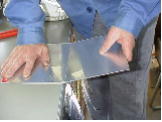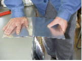 次に持ち上げます。裏返して押し下げても良いです。このさぎょうを 3・4度行います。なれてくれば、アルミ板が金属疲労を起して折りきれる感じが、指先に伝わってきます。 |