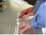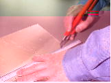 次のポイント・・・この筋を完全に裏にコピーします。カッターの刃を縁にあてがって、裏に位置キズを付けます。あとは初めの時と同じように裏にも筋を付けます。 表と裏の筋があっていればあっているほど、きれいな切断になります。 |