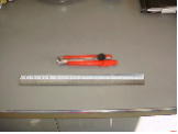 使う道具はこれだけ、物差しと中型のカッターナイフだけです。刃は10ミリほど出します。 |