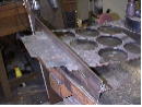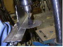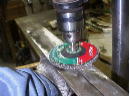 ボール盤に、切断砥石を取り付けます。 縁に沿って削っていきます。ここで注意する点は、切り取らないで、あくまでも両側に筋を付けるだけ、という点です。要はよっこよっこ折りが出来る程度、削れれば良いのです。(アングルの方をあまり削らないようにします) |