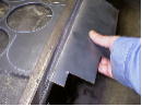 平板小口仕上げ用治具に、切断したい板を挟みます。 (その辺に転がっていた1.6ミリの鉄板です。切り取った残りです) |
