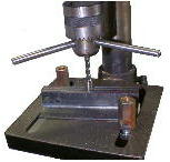 10ミリの丸棒に5.2ミリの下穴(注1)をあけたものを、方ボス治具(テクノ情報コーナー参照)で固定します。左右にあるのは長ボルトです。供回りを防ぐために取り付けています。供回りしなければどんな細工でも良いです。 |