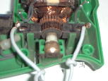 このとき必ず「ペースト」を付けます。電子工作と違って電気工作の場合、錆やらゴミやらで「天ぷらハンダ」になりやすいからです。この後冷却用スリット穴にリード線を通して外部に引き出しますが、外部から引っ張られてもハンダ部分に影響が無いように結び目を作って保護します。位置は適当に調整します。なお、この2本には目印を付けてあとの2本と区別出来るようにしておきます。(スイッチに結線するとき間違えるとショート回路を形成してしまいます)